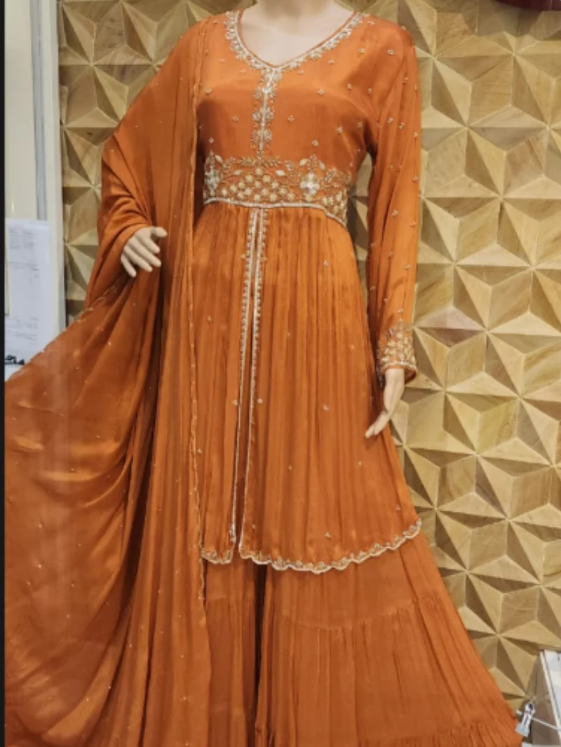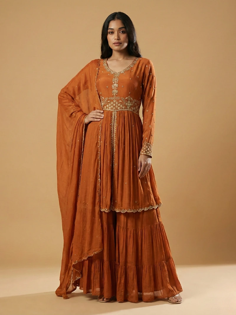 Elegant rust embroidered sharara set with a flowy kurta and matching dupatta, perfect for festive and party occasions.
