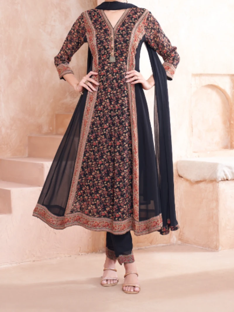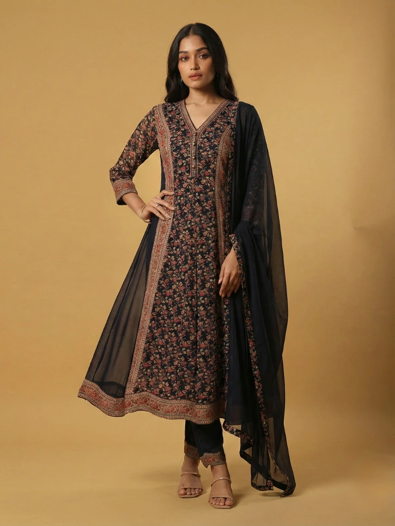 Elegant navy churidar set featuring delicate floral prints and a graceful silhouette, paired with a matching dupatta for a refined party-ready look.