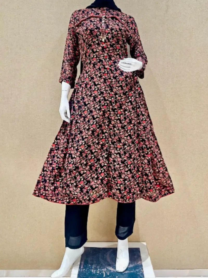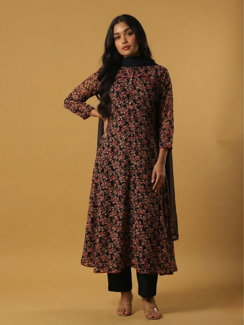 An elegant floral-printed kurta paired with matching straight pants and a graceful shawl. Designed for comfort and style, this ensemble is perfect for everyday elegance, office wear, or casual occasions, offering a refined ethnic look with a modern touch.