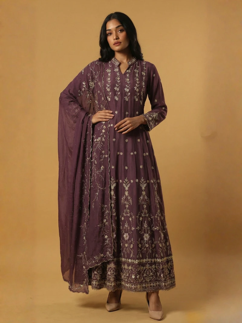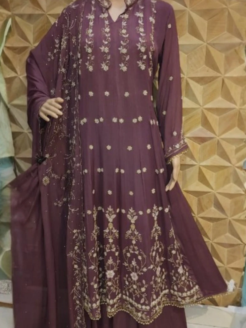 Elegant plum party wear gown adorned with delicate embroidery and paired with a matching dupatta, perfect for festive evenings and special occasions.